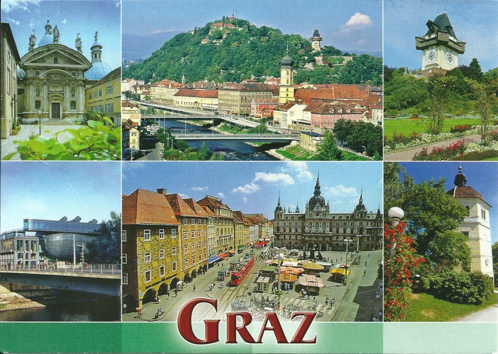 On this card you can see different view, the mausoleum, Schlossberg, Clocktower, Kunsthaus (Museum of Modern Art), Main Square with the Rathaus (Town Hall) and the Belltower.