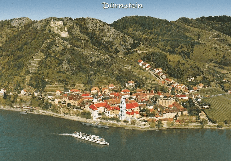On this card you see Dürnstein, a small town on the Danube river in the Krems-Land district, in the Austrian state of Lower Austria. It is one of the most visited tourist destinations in the Wachau region and also a well-known wine growing area. The town gained its name from the medieval castle, Burgruine Dürnstein, which overlooked it. The castle was called “Duerrstein” or “Dürrstein”, from the German duerr/dürr meaning “dry” and Stein, “stone”. The castle was dry because it was situated on a rocky hill, high above the damp conditions of the Danube at the base of the hill, and it was built of stone