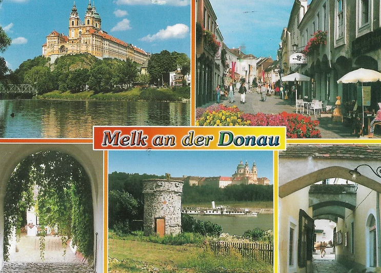 The impressive abbey you see on this card is called the Melk Abbey (Stift Melk). It was founded in 1089 when Benedictine monks were given a castle and transformed it into the Abbey. A school was founded as well in the twelveth century.
